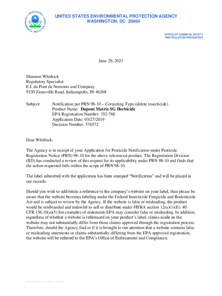 UNITED STATES ENVIRONMENTAL PROTECTION AGENCY WASHINGTON, DC 20460 OFFICE OF CHEMICAL SAFETY AND POLLUTION PREVENTION June 29, 2021Shannon Whitlock Regulatory Specialist E.I. du Pont de Nemours and