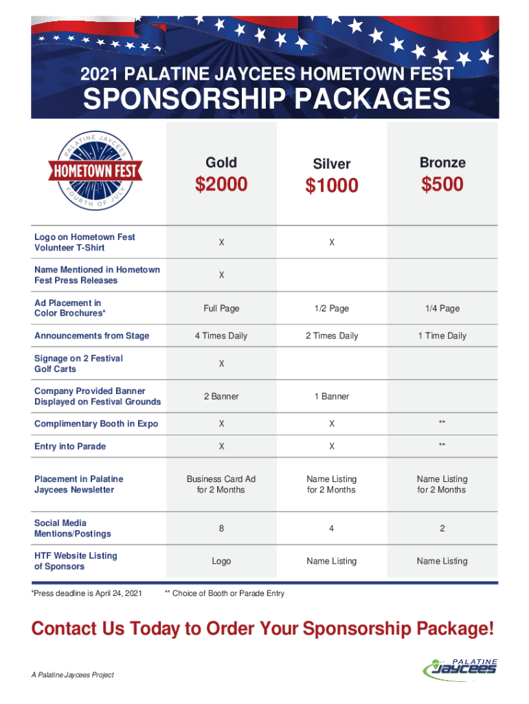 2021 PALATINE JAYCEES HOMETOWN FESTSPONSORSHIP PACKAGES GoldSilverBronze$$$20001000500Logo on Hometown Fest Volunteer TShirtXXName Mentioned in Hometown Fest Press Released Placement in Color Brochures*