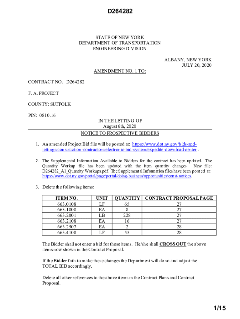 D264282STATE OF NEW YORK DEPARTMENT OF TRANSPORTATION ENGINEERING DIVISIONAMENDMENT NO. 1 TO:ALBANY, NEW YORK JULY 20, 2020CONTRACT NO. D264282 F. A. PROJECT COUNTY: SUFFOLK PIN: 0810.16IN THE LETTING