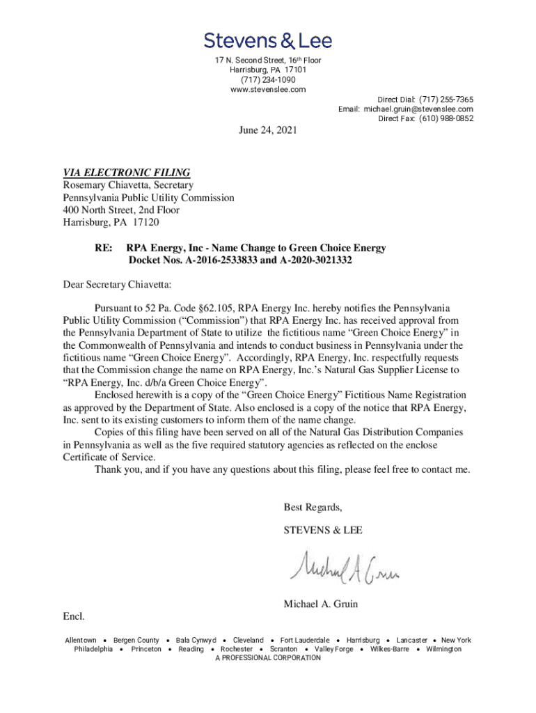 17 N. Second Street, 16th Floor Harrisburg, PA 17101 (717) 2341090 www.stevenslee.com Direct Dial: (717) 2557365 Email: michael.gruin@stevenslee.com Direct Fax: (610) 9880852June 24, 2021VIA ELECTRONIC