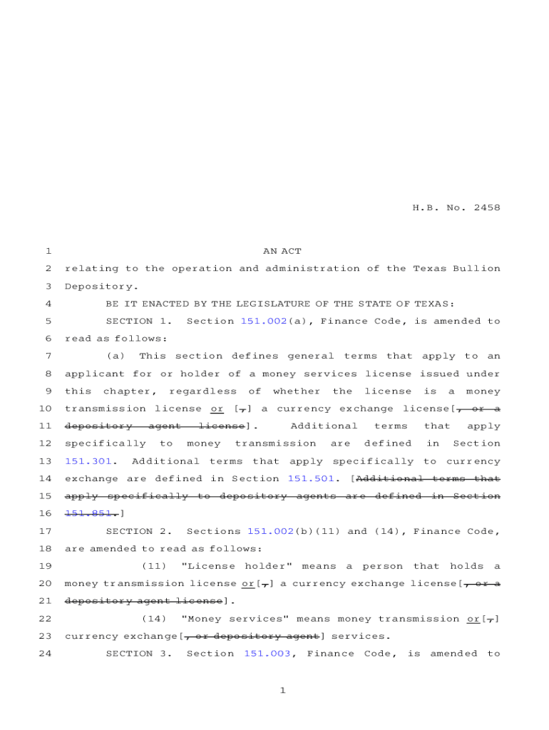 H.B.ANO. A24581AN ACT2relating to the operation and administration of the Texas Bullion3Depository.4BE IT ENACTED BY THE LEGISLATURE OF THE STATE OF TEXAS:5SECTIONA1. Section 151.002(a), Finance Code,