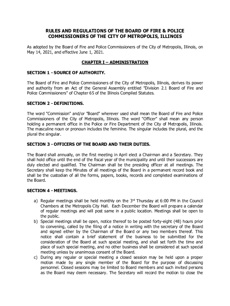 RULES AND REGULATIONS OF THE BOARD OF FIRE & POLICE COMMISSIONERS OF THE CITY OF METROPOLIS, ILLINOIS As adopted by the Board of Fire and Police Commissioners of the City of Metropolis, Illinois,