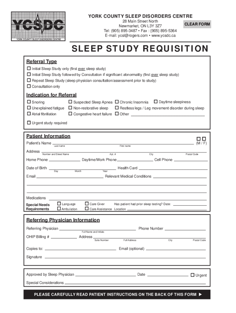 YORK COUNTY SLEEP DISORDERS Center 28 Main Street North Newmarket, ON L3Y 3Z7 Tel: (905) 8953487 Fax : 905 8955364 Email: ycsl@rogers.com www.ycsdc.caCLEAR FORMULAE STUDY REQUISITIONCLEAR FORMReferral
