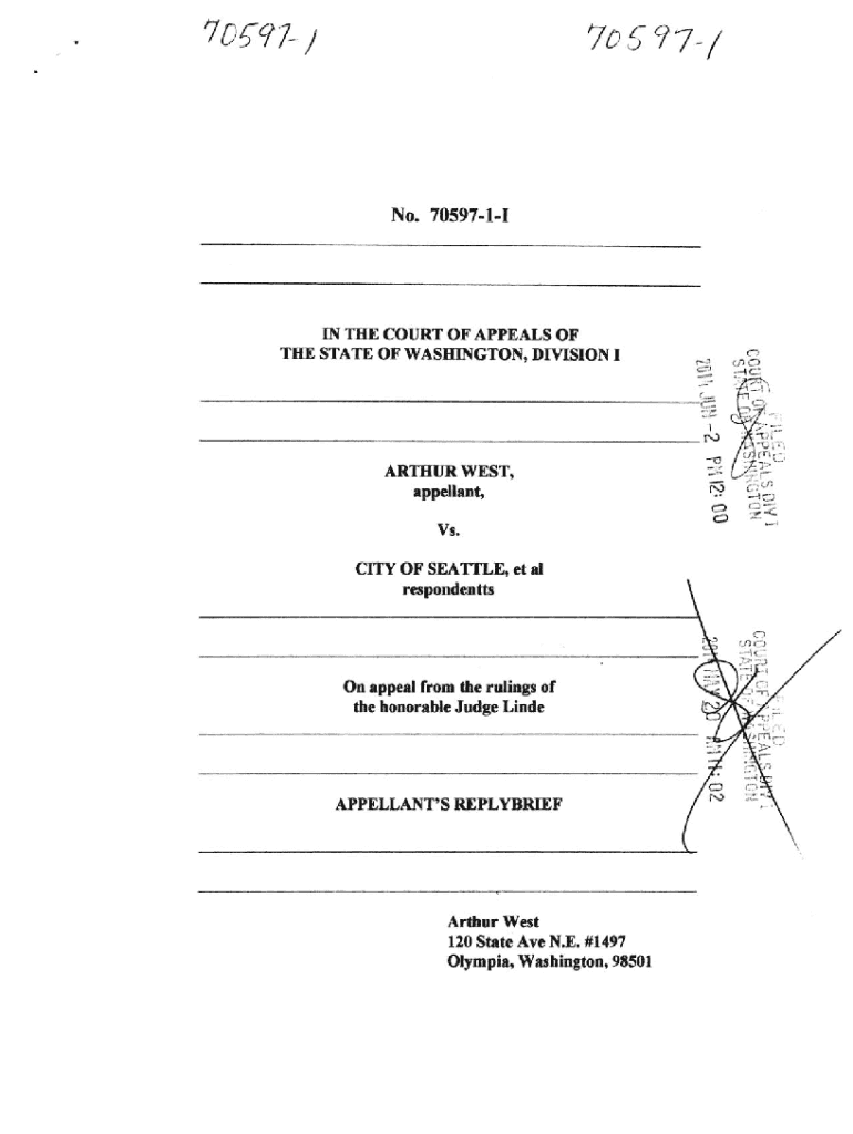 1D5\” 97j7D5 9 7/No. 70597. 11IN THE COURT OF APPEALS OF THE STATE OF WASHINGTON, DIVISION I C(. J...___ ARTHUR WEST, appellant, VS. CITY OF SEA TILE, ET at respondents appeal from the rulings
