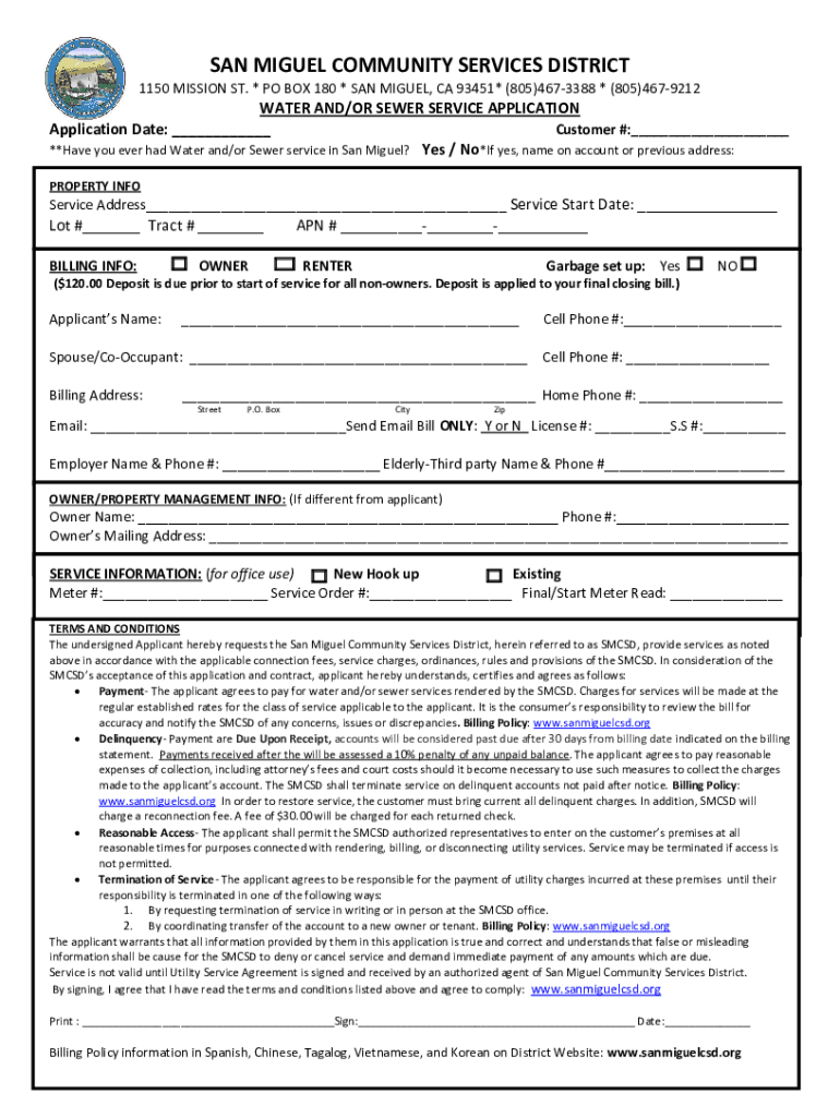 SAN MIGUEL COMMUNITY SERVICES DISTRICT 1150 MISSION ST. * PO BOX 180 * SAN MIGUEL, CA 93451* (805)4673388 * (805)4679212WATER AND/OR SEWER SERVICE APPLICATION Date: ___ Customer #:___ **Have you ever