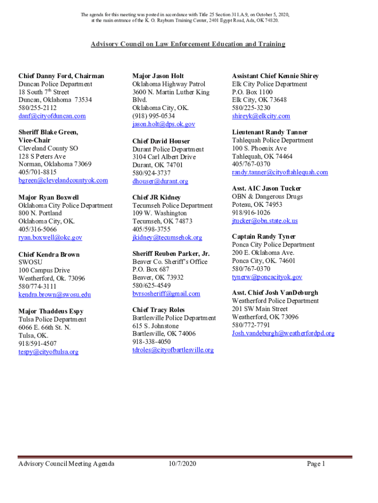 The agenda for this meeting was posted in accordance with Title 25 Section 311. A.9, on October 5, 2020, at the main entrance of the K. O. Rayburn Training Center, 2401 Egypt Road, Ada, OK 74820.