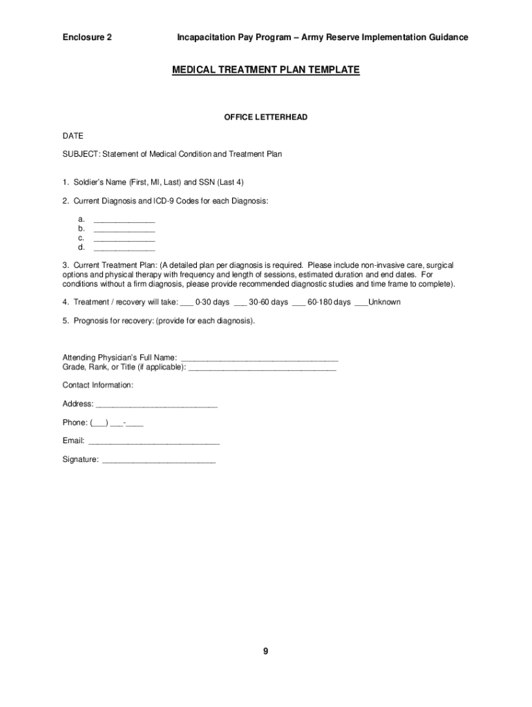 Enclosure 2Incapacitation Pay Program Army Reserve Implementation GuidanceMEDICAL TREATMENT PLAN TEMPLATEOFFICE LETTERHEAD DATE SUBJECT: Statement of Medical Condition and Treatment Plan1. Soldiers
