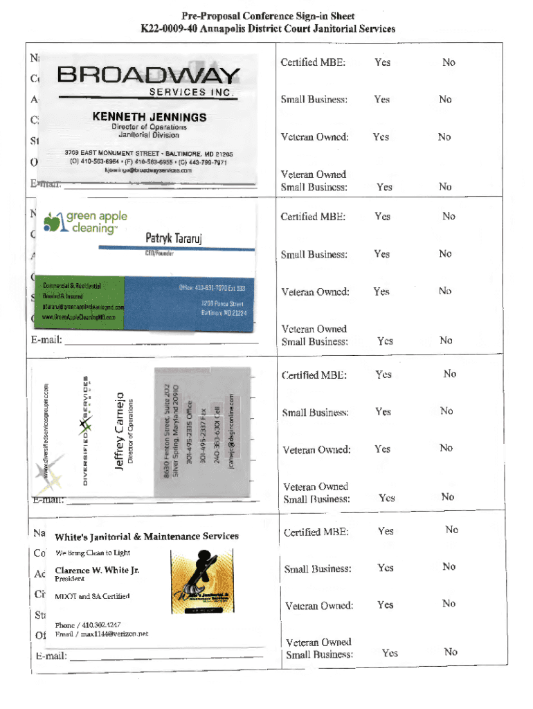 Proposal Conference Signing Sheet K22000940 Annapolis District Court Janitorial Services N:BROAD:lAY0SERVICES INC. A, Yes Small Business:YesNoVeteran Owned:YesNoKENNETH JENNINGSCDirector of OperationsJanitorial