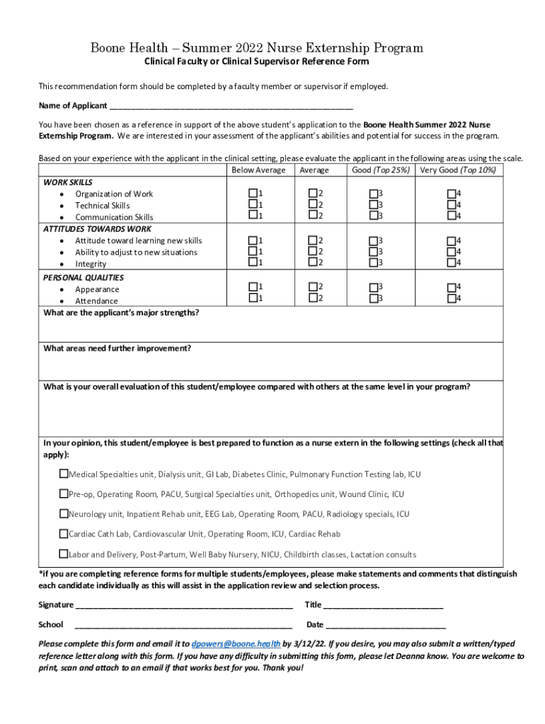 Boone Health Summer 2022 Nurse Externship Program Clinical Faculty or Clinical Supervisor Reference Forms recommendation form should be completed by a faculty member or supervisor if employed. Name