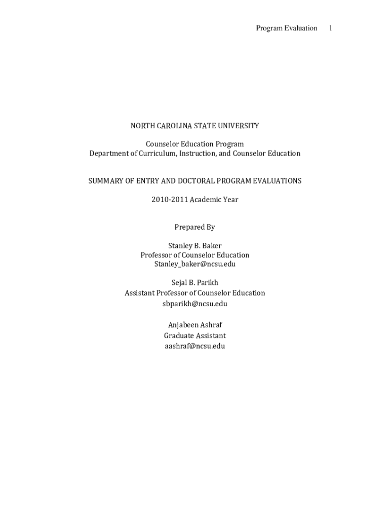 Program EvaluationNORTH CAROLINA STATE UNIVERSITYCounselor Education Program Department of Curriculum, Instruction, and Counselor Education SUMMARY OF ENTRY AND DOCTORAL PROGRAM EVALUATIONS 20102011