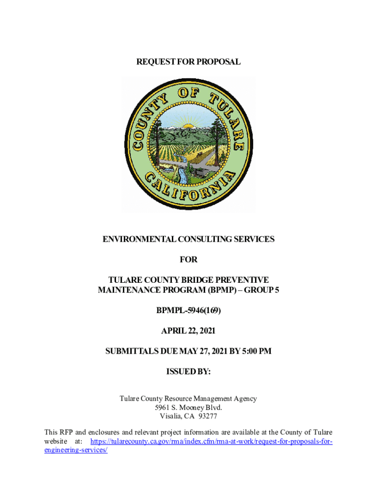 REQUEST FOR PROPOSALENVIRONMENTAL CONSULTING SERVICES FOR TULARE COUNTY BRIDGE PREVENTIVE MAINTENANCE PROGRAM (BUMP) GROUP 5 BPMPL5946(169) APRIL 22, 2021, SUBMITTALS DUE MAY 27, 2021, BY 5:00 PM