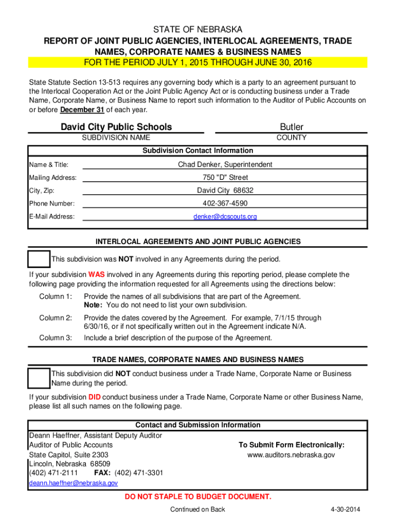 STATE OF NEBRASKA REPORT OF JOINT PUBLIC AGENCIES, INTERLOCK AGREEMENTS, TRADE NAMES, CORPORATE NAMES & BUSINESS NAMES FOR THE PERIOD JULY 1, 2015, THROUGH JUNE 30, 2016, State Statute Section 13513