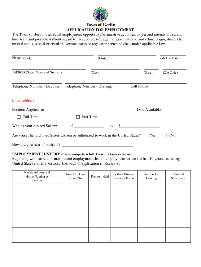 Get the free www.berlinct.govegovdocumentsAPPLICATION FOR EMPLOYMENT - Home / Berlin, CT