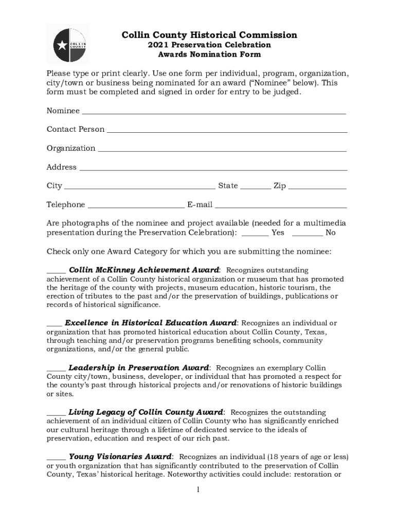 Collin County Historical Commission 2021 Preservation Celebration Awards Nomination Formulas type or print clearly. Use one form per individual, program, organization, city/town or business being