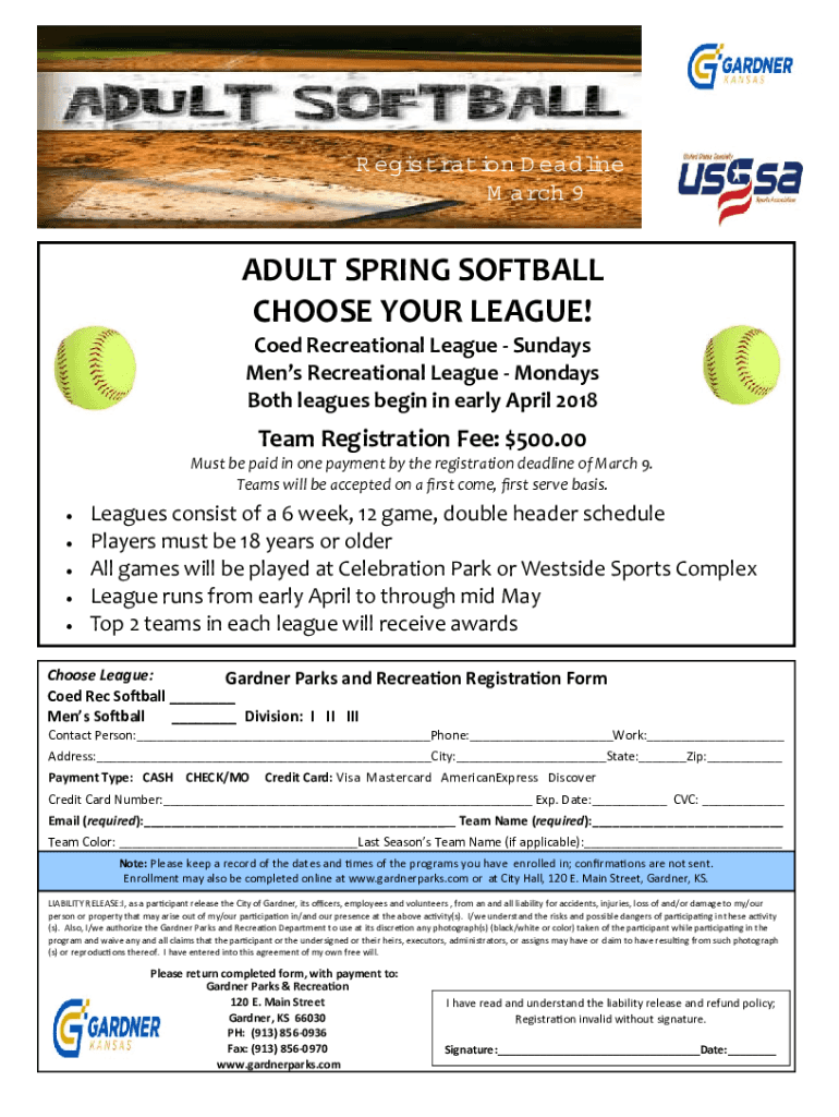 Registration Deadline M.Arch. 9ADULT SPRING SOFTBALL CHOOSE YOUR LEAGUE! Coed Recreational League Sundays Men Recreational League Mondays Both leagues begin in early April 2018Team Registration Fee: