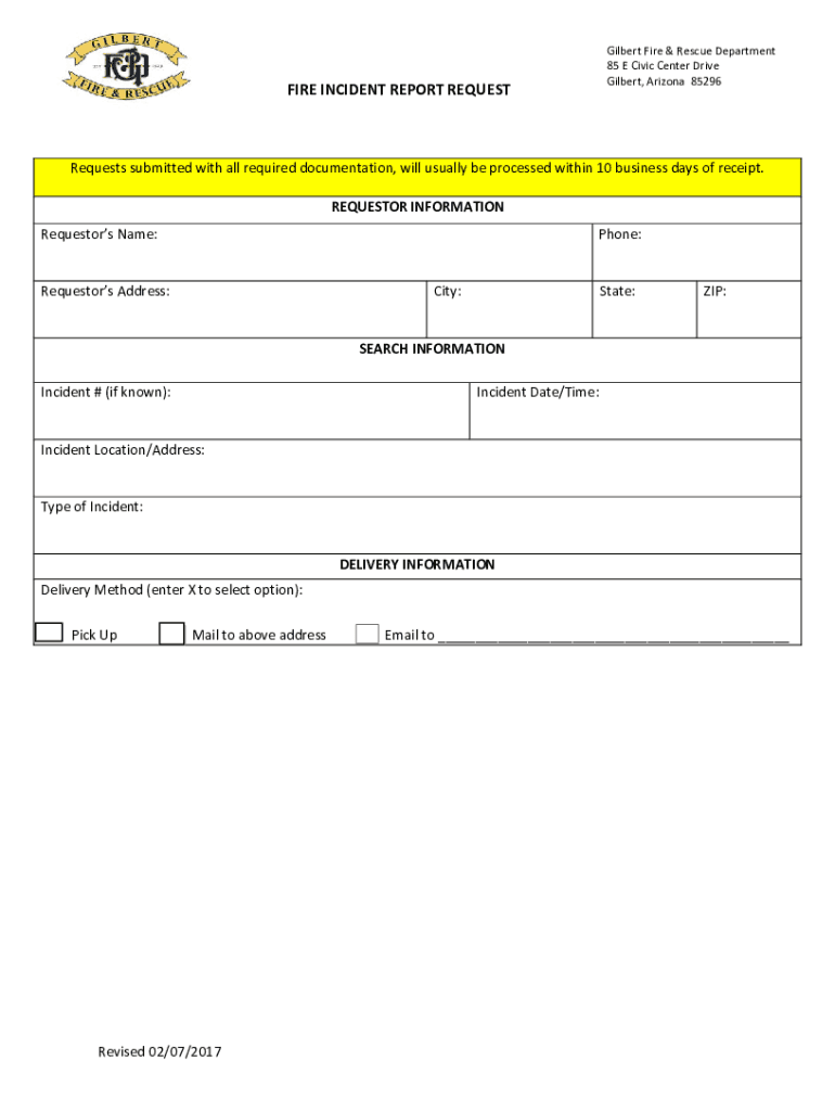 Gilbert Fire & Rescue Department 85 E Civic Center Drive Gilbert, Arizona 85296FIRE INCIDENT REPORT REQUESTRequests submitted with all required documentation, will usually be processed within 10 business