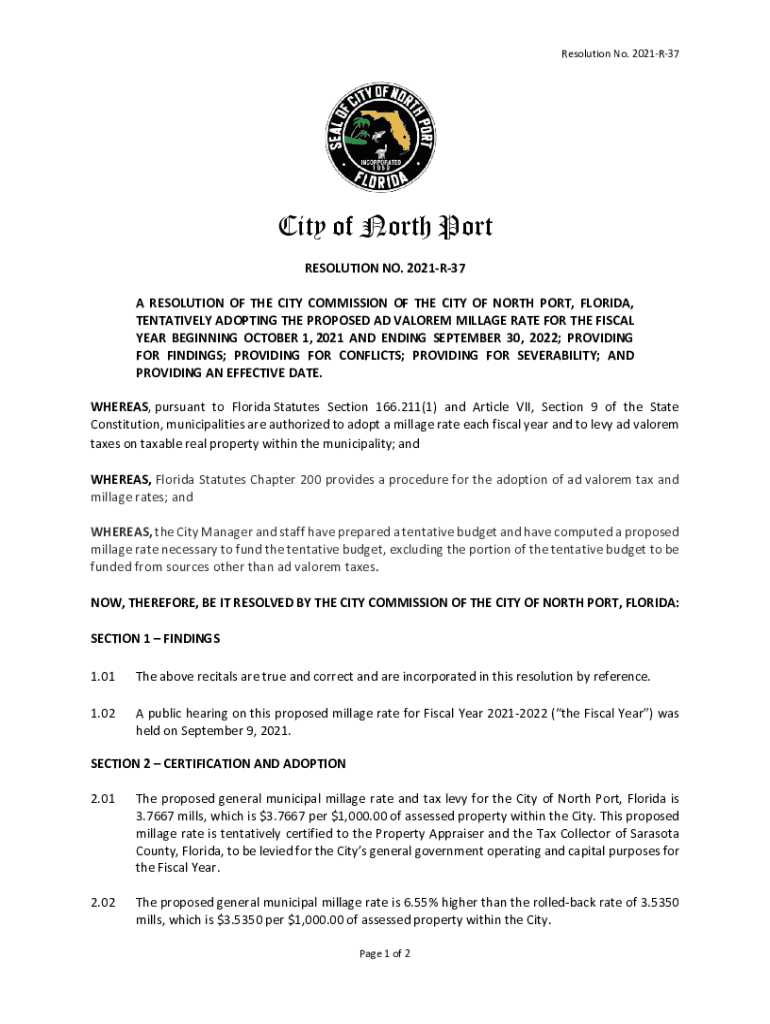 Resolution No. 2021R37City of North Port RESOLUTION NO. 2021R37 A RESOLUTION OF THE CITY COMMISSION OF THE CITY OF NORTH PORT, FLORIDA, TENTATIVELY ADOPTING THE PROPOSED AD VALOR EM MILLAGE RATE FOR
