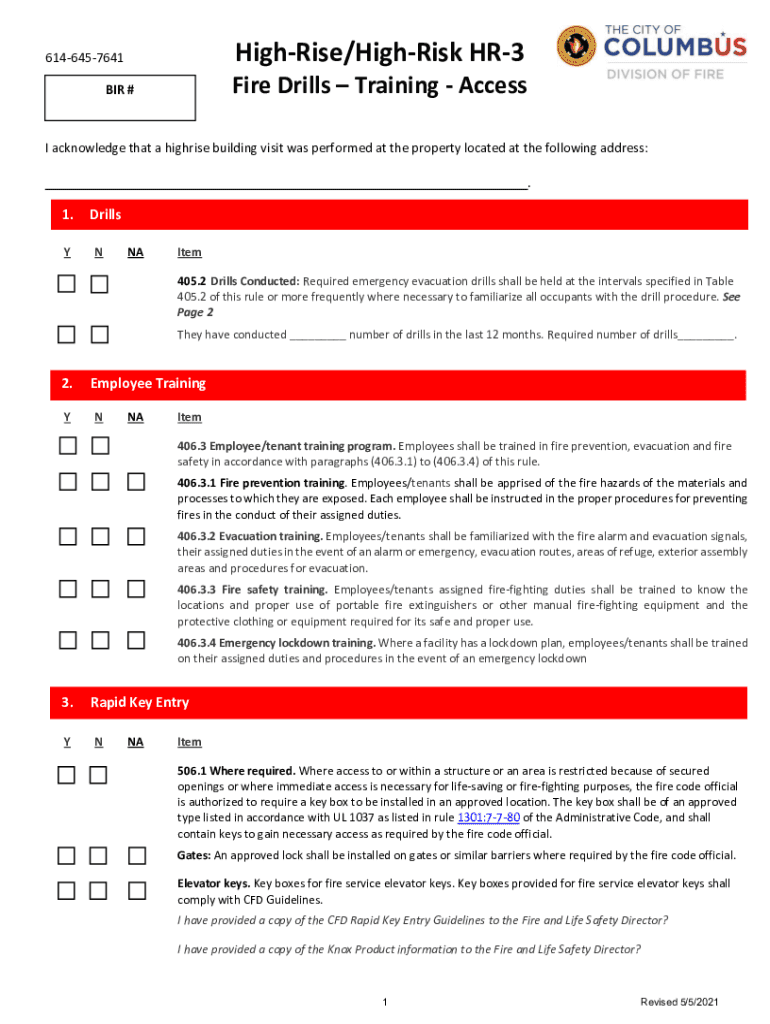 High-rise/High-rise HR36146457641Fire Drills Training Access BIR #I acknowledge that a high rise building visit was performed at the property located at the following address: .1. Drills Invited 405.2
