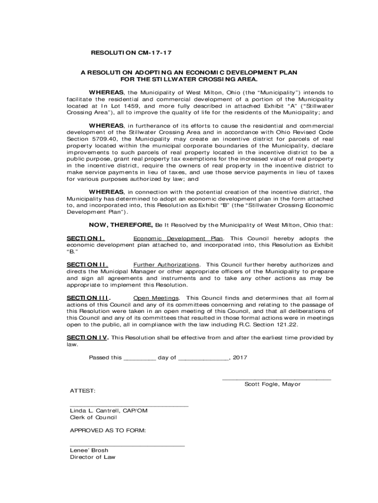 RESOLUTION CM1717 A RESOLUTION ADOPTING AN ECONOMIC DEVELOPMENT PLAN FOR THE STILLWATER CROSSING AREA. WHEREAS, the Municipality of West Milton, Ohio (the Municipality) intends to facilitate the residential