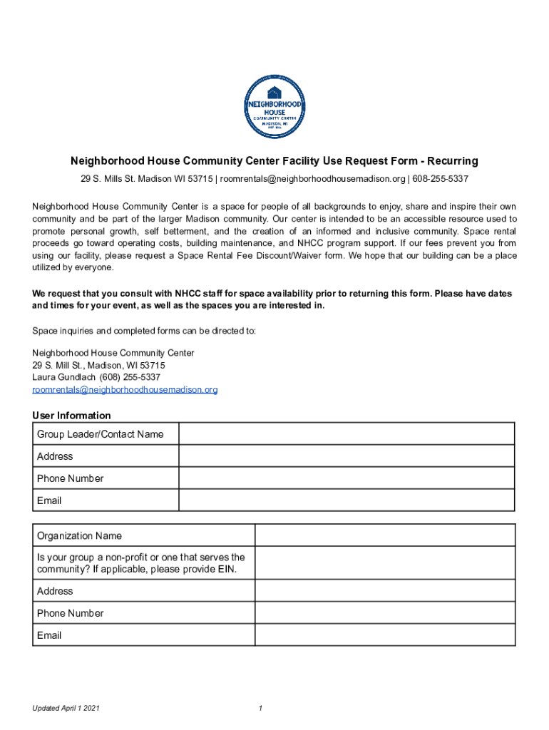 Get the free Neighborhood House Community Center Facility Use Request Form - Recurring 4.2021