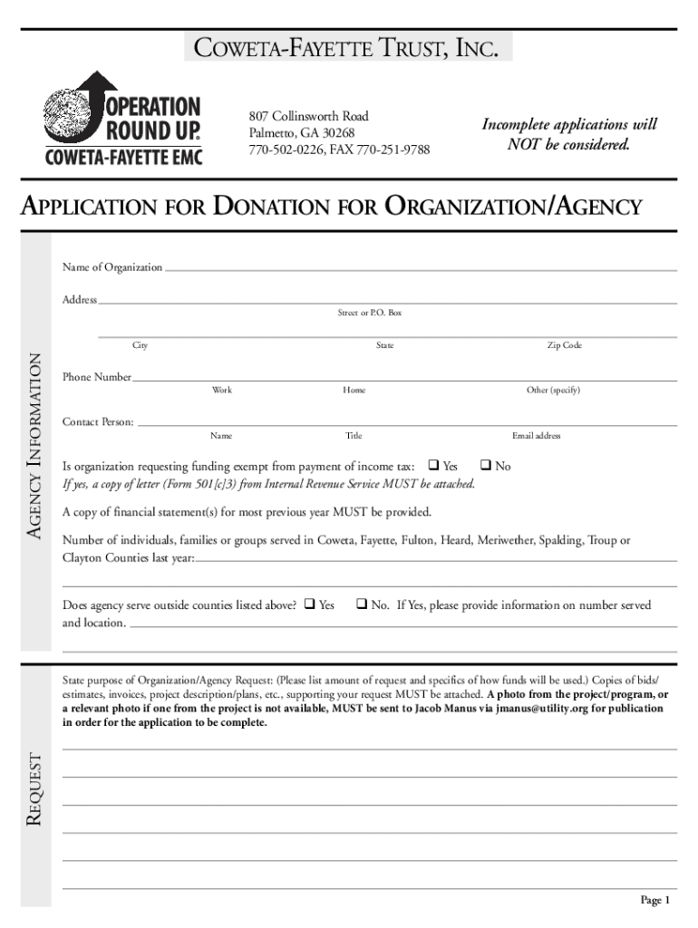 NOT be considered. APPLICATION FOR DONATION FOR ORGANIZATION/AGENCY