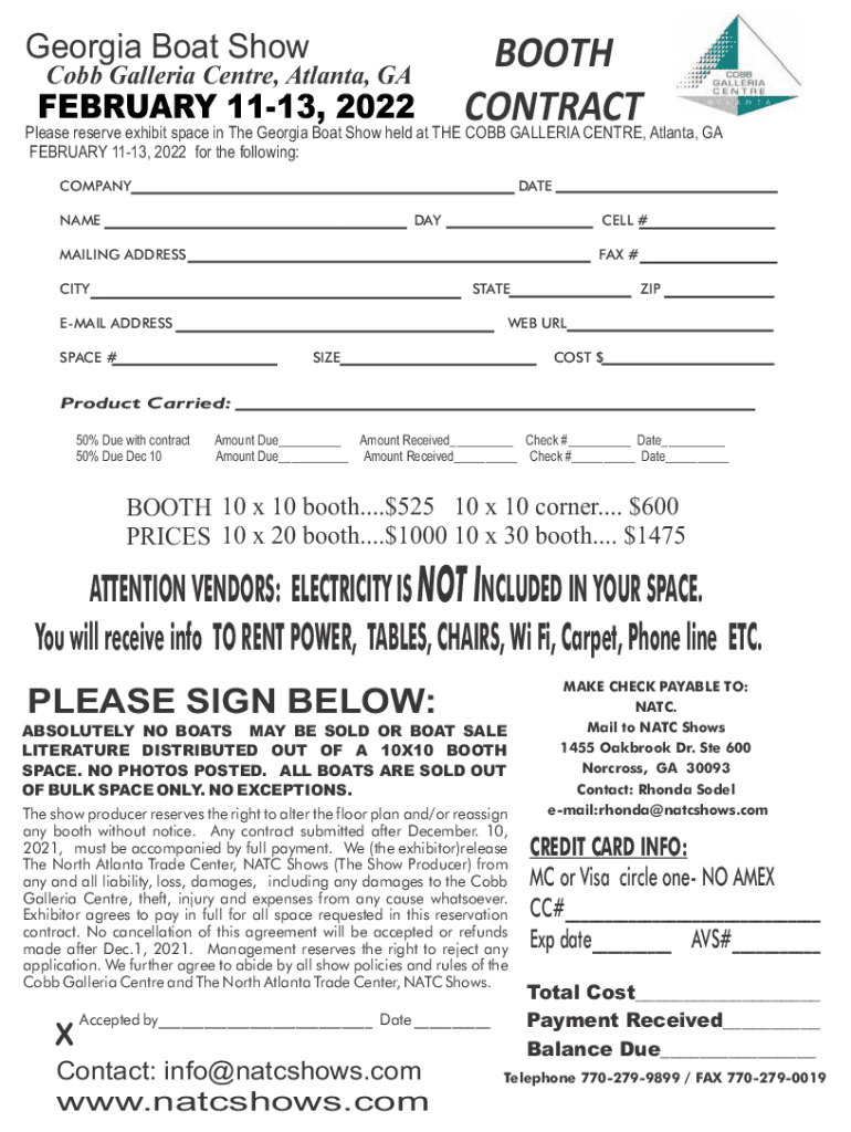 Georgia Boat Show Cobb Galleria Center, Atlanta, FEBRUARY 1113, 2022BOOTH CONTRACTPlease reserve exhibit space in The Georgia Boat Show held at THE COBB GALLERIA Center, Atlanta, GA FEBRUARY 1113,