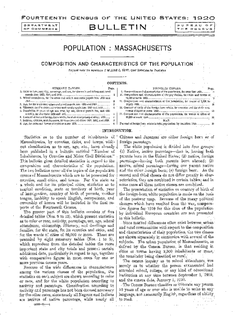 F\'FOURTEENTH D EP A RT M E N.TOFCOMMERCECENSUSOF BULLETIN POPULATION19.20UNITED. STATES:BUREAU Theft::NSUSMASSACHUSETTSCOMPOSlrlON AND CHARACTERISTICS OF THE POPULATION Prepared under the supervision