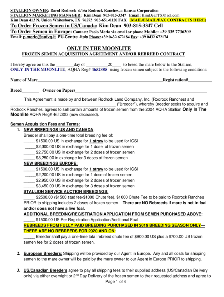 STALLION OWNER: Carol Rodrick d/b/a Rodrick Ranches, a Kansas Corporation STALLION MARKETING MANAGER: Kim Dean 9038153347 Email: KimDeanTX@aol.com Kim Dean 413 N. Union Whiteboard, TX 76273 9036510120