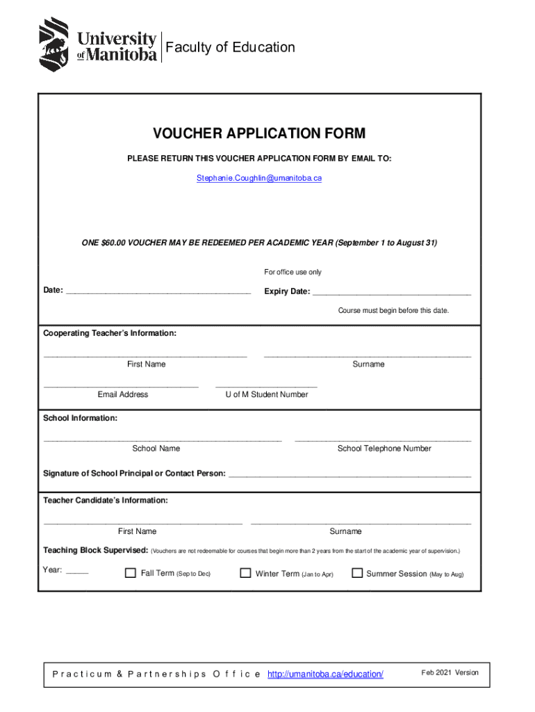 Faculty of EducationVOUCHER APPLICATION FOR COOPERATING TEACHERS Thank you for hosting University of Manitoba Teacher Candidates in your classroom. Course vouchers are issued as an acknowledgement