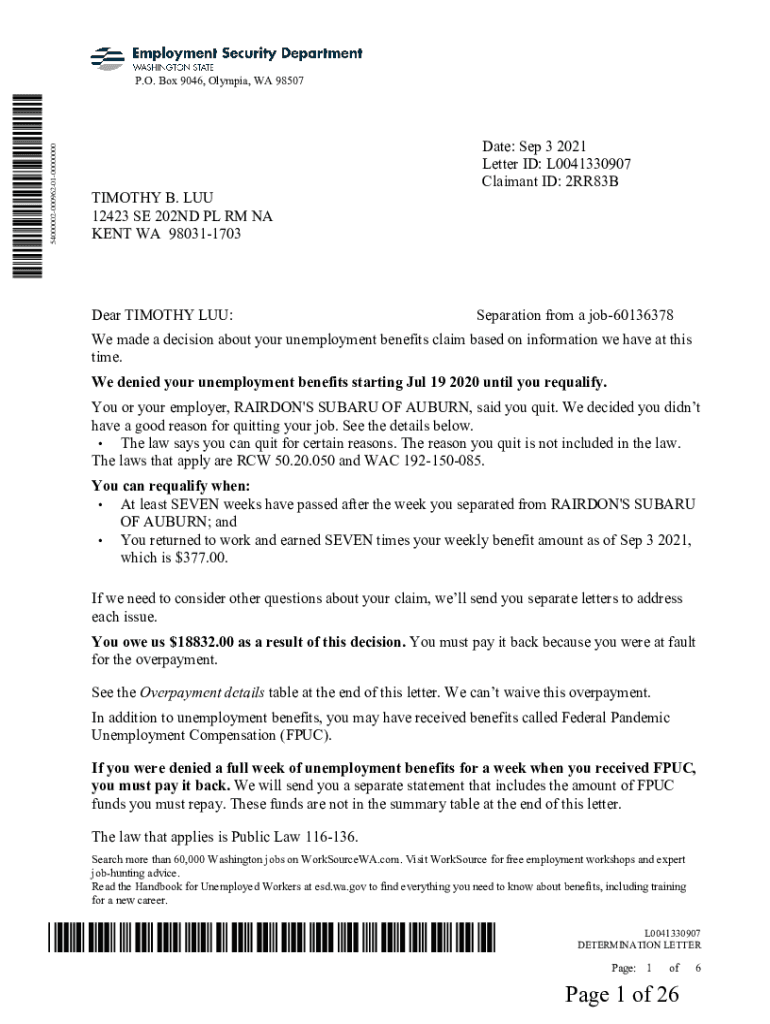 540000020009620100000000P. O. Box 9046, Olympia, WA 98507Date: Sep 3 2021 Letter ID: L0041330907 Claimant ID: 2RR83B TIMOTHY B. LULU 12423 SE 202ND PL RM NA KENT WA 980311703Dear TIMOTHY LULU:Separation