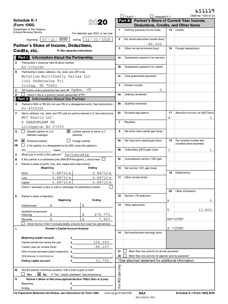 651119 Final K1Schedule K1 (Form 1065)Part III Partners Share of Current Year Income, Deductions, Credits, and Other Items2020Department of the Treasury Internal Revenue Service21/2020/12ending31
