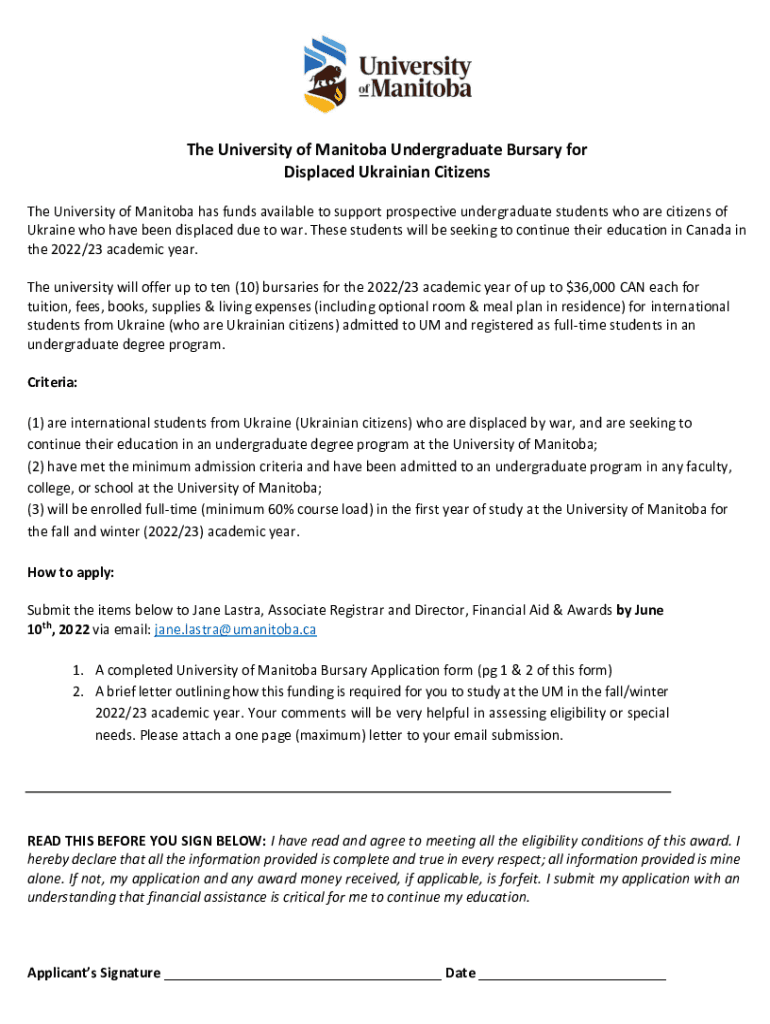 The University of Manitoba Undergraduate Bursary for Displaced Ukrainian Citizens The University of Manitoba has funds available to support prospective undergraduate students who are citizens of Ukraine