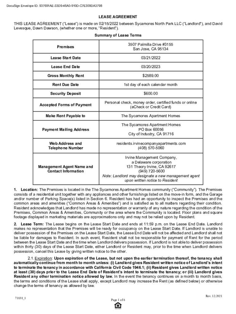 DocuSign Envelope ID: 937691AE33D946A0910DC7E309DA3798LEASE AGREEMENT THIS LEASE AGREEMENT (Lease) is made on 02/15/2022 between Sycamores North Park LLC (Landlord), and David Levesque, Dawn Dawson,