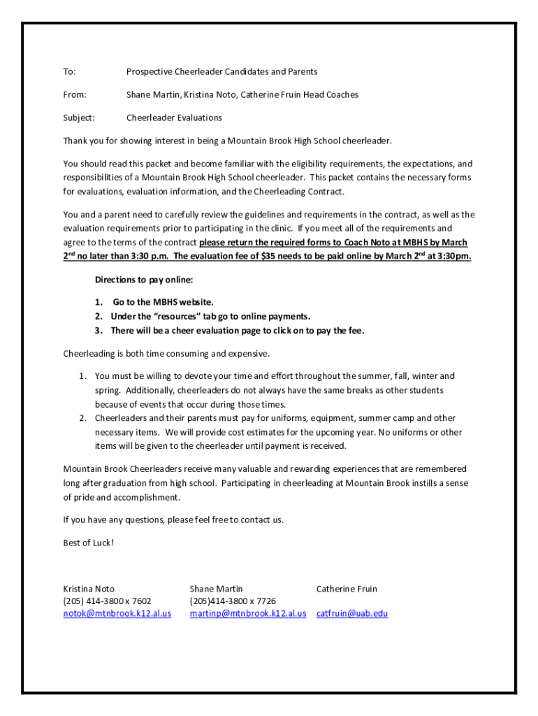 To:Prospective Cheerleader Candidates and ParentsFrom:Shane Martin, Kristina Not, Catherine Fruit Head CoachesSubject:Cheerleader EvaluationsThank you for showing interest in being a Mountain Brook