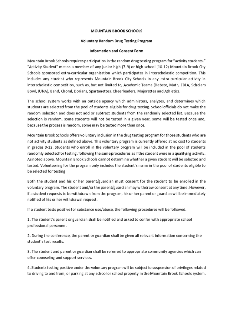 MOUNTAIN BROOK SCHOOLS Voluntary Random Drug Testing Program Information and Consent Form Mountain Brook Schools requires participation in the random drug testing program for activity students. \”