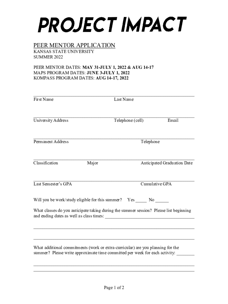 PEER MENTOR APPLICATION KANSAS STATE UNIVERSITY SUMMER 2022PEER MENTOR DATES: MAY 31JULY 1, 2022 & AUG 1417 MAPS PROGRAM DATES: JUNE 3JULY 1, 2022 COMPASS PROGRAM DATES: AUG 1417, 2022 ___ First Name