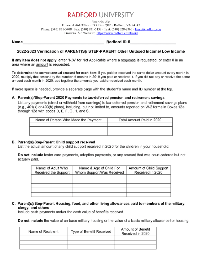 Financial Aid Office P.O. Box 6905 Bradford, VA 24142 Phone: (540) 8315408 Fax: (540) 8315138 Text: (540) 3289360 finaid@radford.edu Financial Aid Website: https://www.radford.edu/finaidName___ Bradford