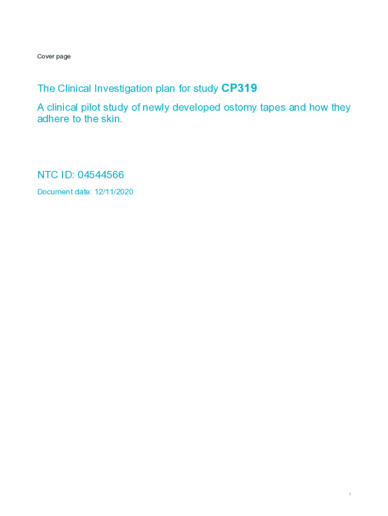 Cover palette Clinical Investigation plan for study CP319 A clinical pilot study of newly developed ostomy tapes and how they adhere to the skin.NTC ID: 04544566 Document date: 12/11/20201Clinical