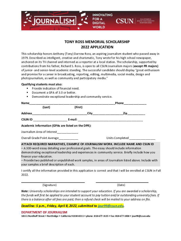 TONY ROSS MEMORIAL SCHOLARSHIP 2022 APPLICATION This scholarship honors Anthony (Tony) Darrow Ross, an aspiring journalism student who passed away in 1979. Described as intelligent, creative and charismatic,