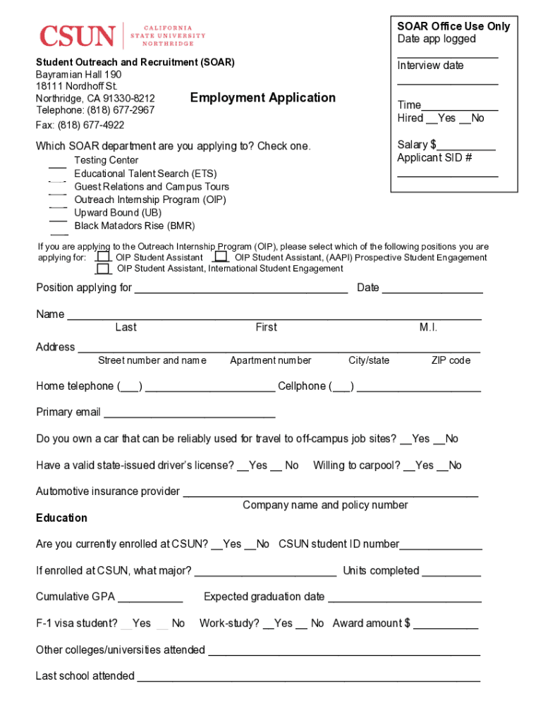 Student Outreach and Recruitment (SOAR) Bahamian Hall 190 18111 Nordhoff St. Employment Northridge, CA 913308212 Telephone: (818) 6772967 Fax: (818) 6774922SOAR Office Use Only Date app logged ___
