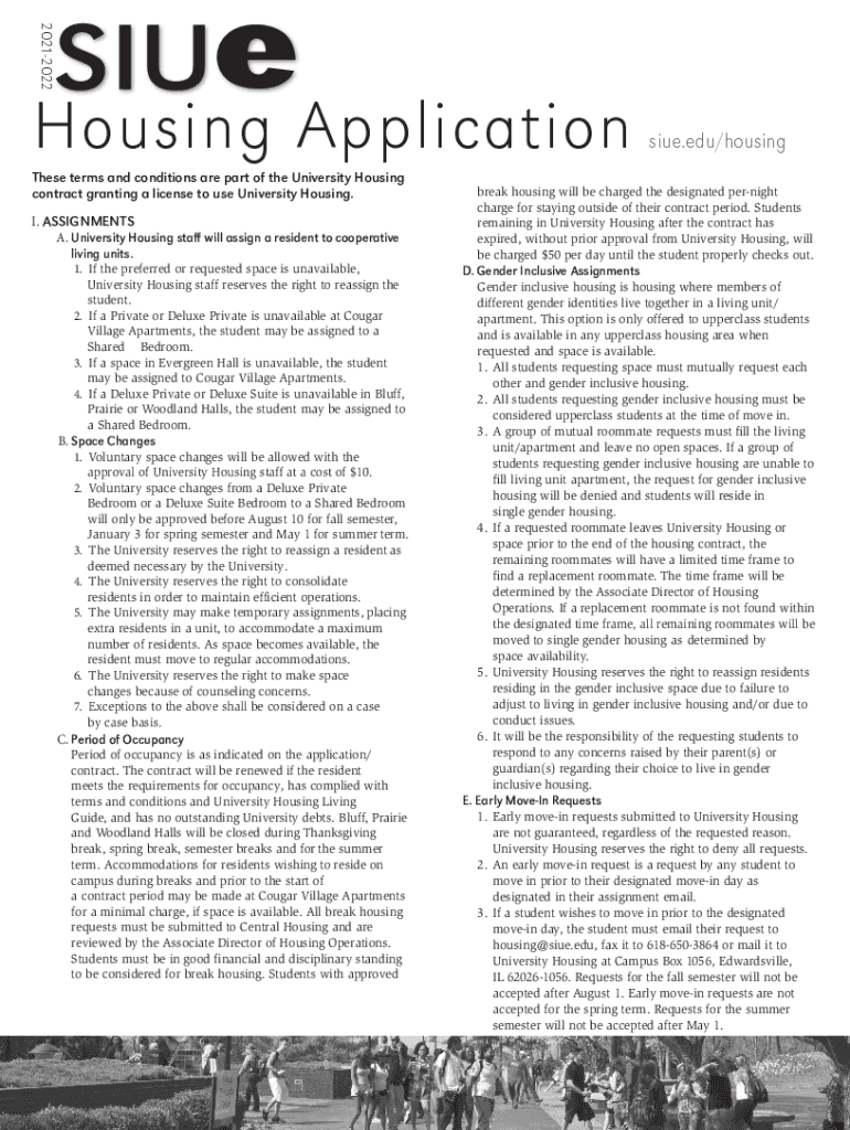 20212022Housing Application These terms and conditions are part of the University Housing contract granting a license to use University Housing. I. ASSIGNMENTS. University Housing staff will assign