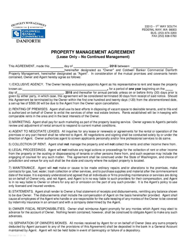 33313 1ST WAY SOUTH FEDERAL WAY, WA 98003 BUS. (253) 8743200 FAX (253) 8380760PROPERTY MANAGEMENT AGREEMENT (Lease Only No Continued Management) day of, 2018 between: _ hereinafter designated as \”