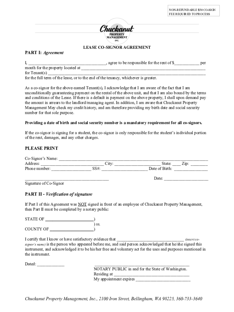 LEASE CONSIGNOR AGREEMENTPART I: Agreement I, ___, agree to be responsible for the rent of $___ per month for the property located at ___ for Tenant(s) ___ for the full term of the lease, or to the