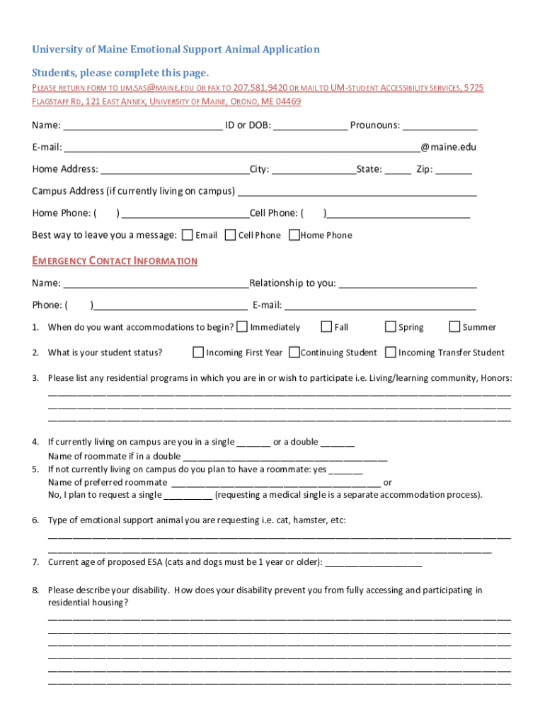 University of Maine Emotional Support Animal Application Students, please complete this page. PLEASE RETURN FORM TO UM.SAS@MAINE.EDU OR FAX TO 207.581.9420 OR MAIL TO STUDENT ACCESSIBILITY SERVICES,
