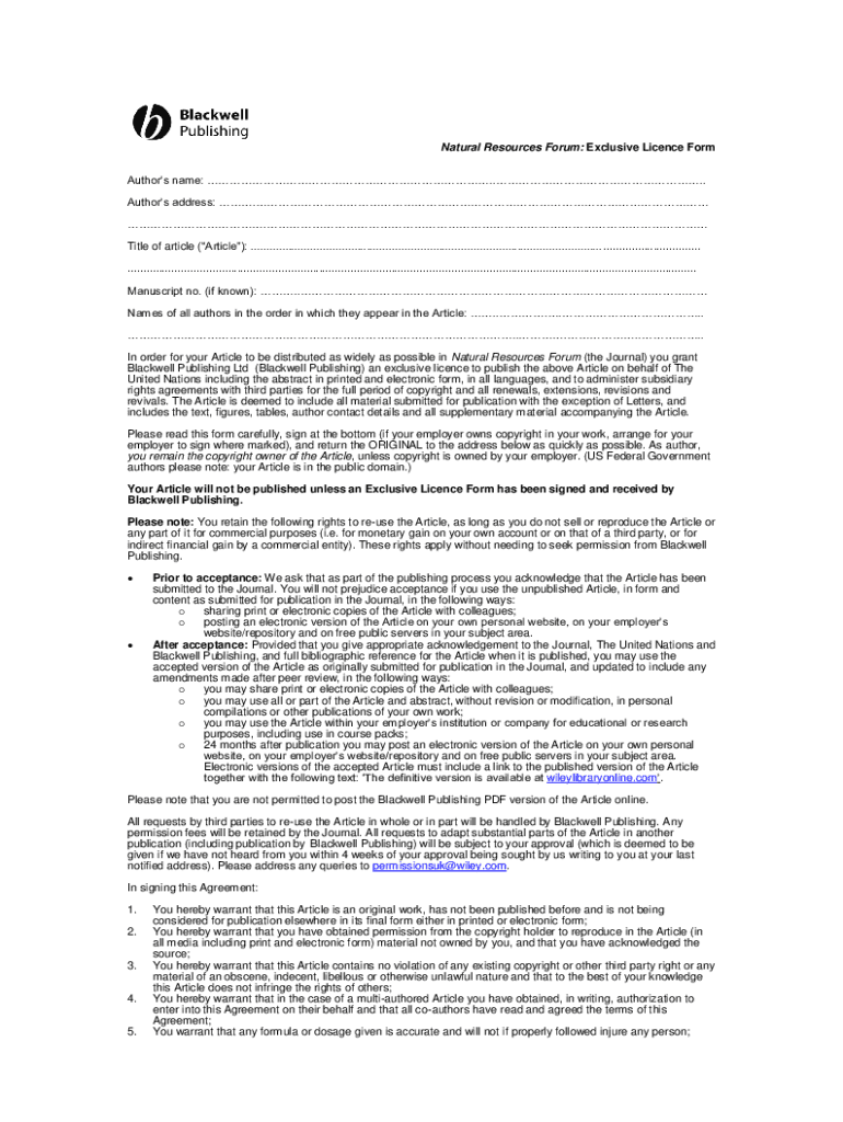 Natural Resources Forum: Exclusive License Form Authors name: .... Authors address:. . Title of article (Article):