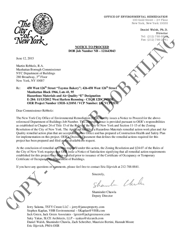 OFFICE OF ENVIRONMENTAL REMEDIATION 100 Gold Street 2nd Floor New York, New York 10038 Daniel Walsh, Ph.D. Director Tel: (212) 7888841 Fax: (212) 7882941NOTICE TO PROCEED DOB Job Number NB 121643043