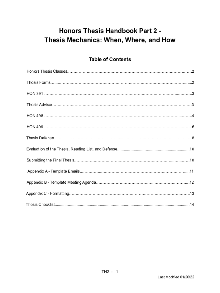 Honors Thesis Handbook Part 2 Thesis Mechanics: When, Where, and How Table of Contents Honors Thesis Classes.2 Thesis Forms..........2 HON 391 .....3 Thesis Advisor