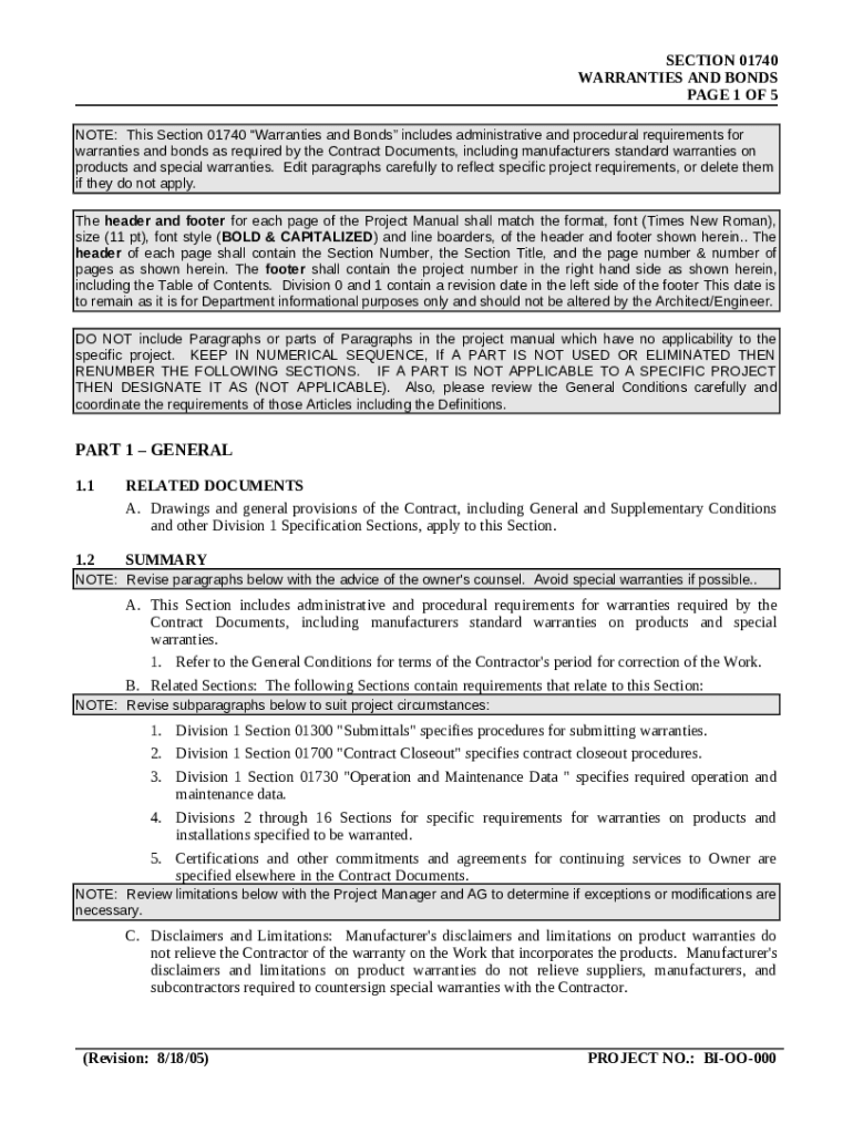 Instructions for the NOTE: This Section 01740 'Warranties and Bonds includes administrative ... form