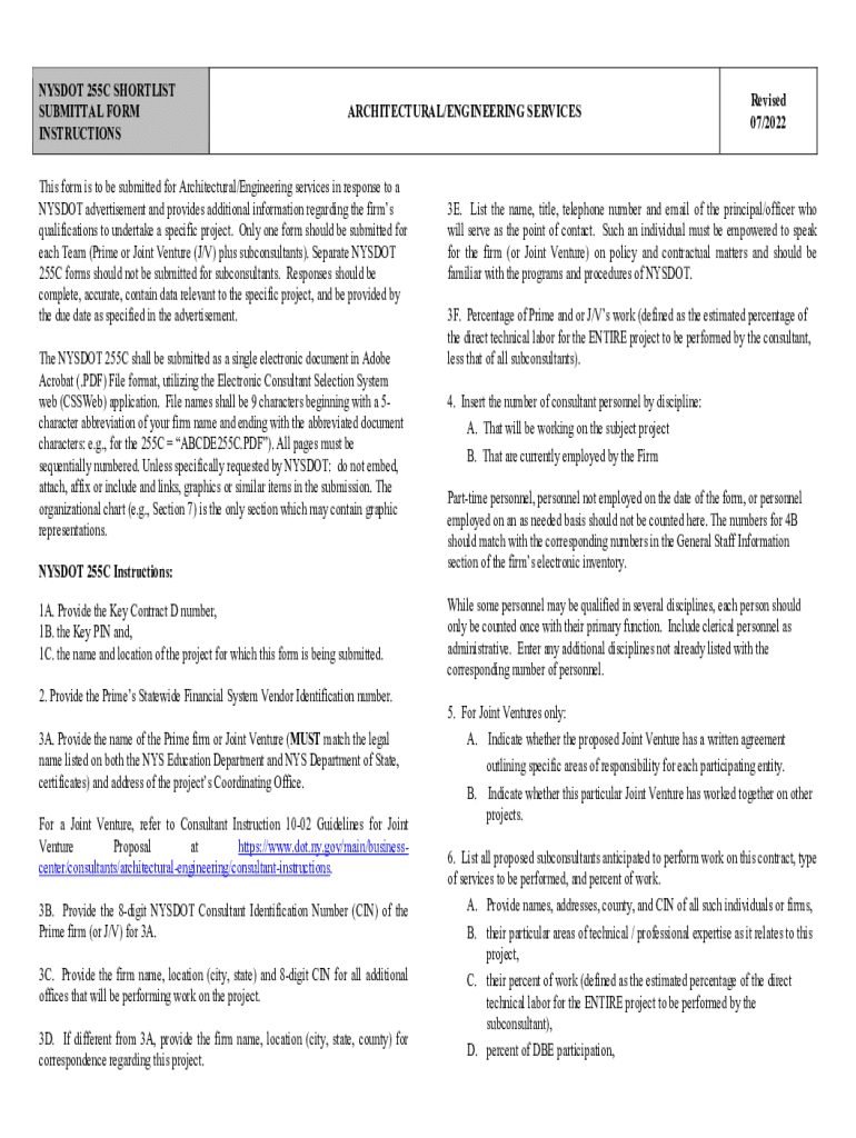 Information required on nysdot 255c shortlist revised includes company details, project experience, financial information, and references.