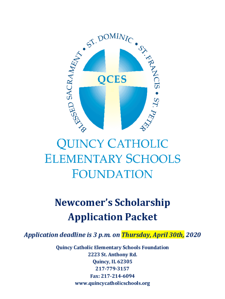 Newcomers Scholarship Application Packet Application deadline is 3 p.m. on Thursday, April 30th, 2020 Quincy Catholic Elementary Schools Foundation 2223 St. Anthony Rd. Quincy, IL 62305 2177793157